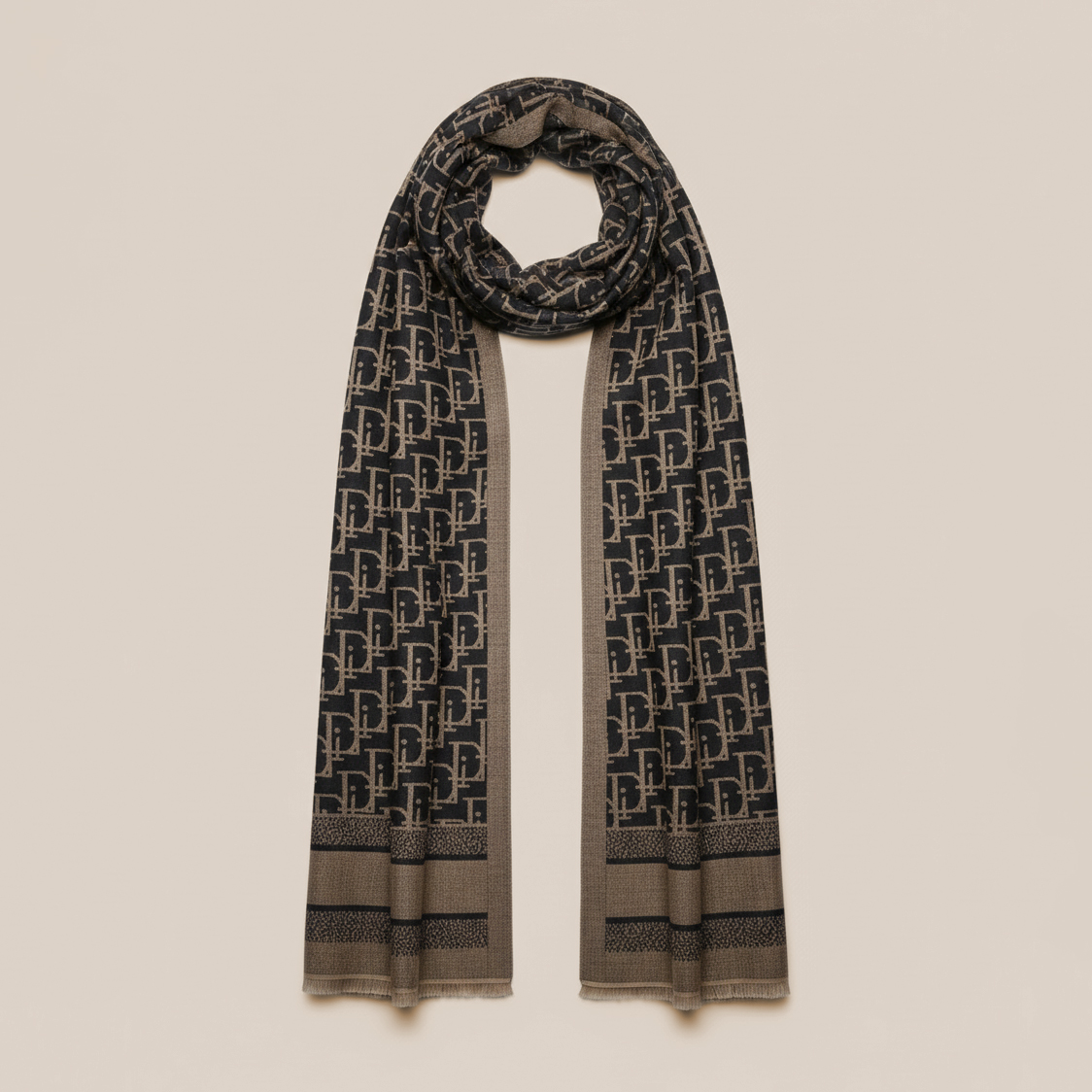 Le motif géométrique répété apporte une dimension visuelle unique, tandis que les bords délicatement finis témoignent d’un souci du détail exceptionnel. Ses tons beige et noir permettent de l’associer aussi bien à un manteau habillé qu’à une veste décontractée.