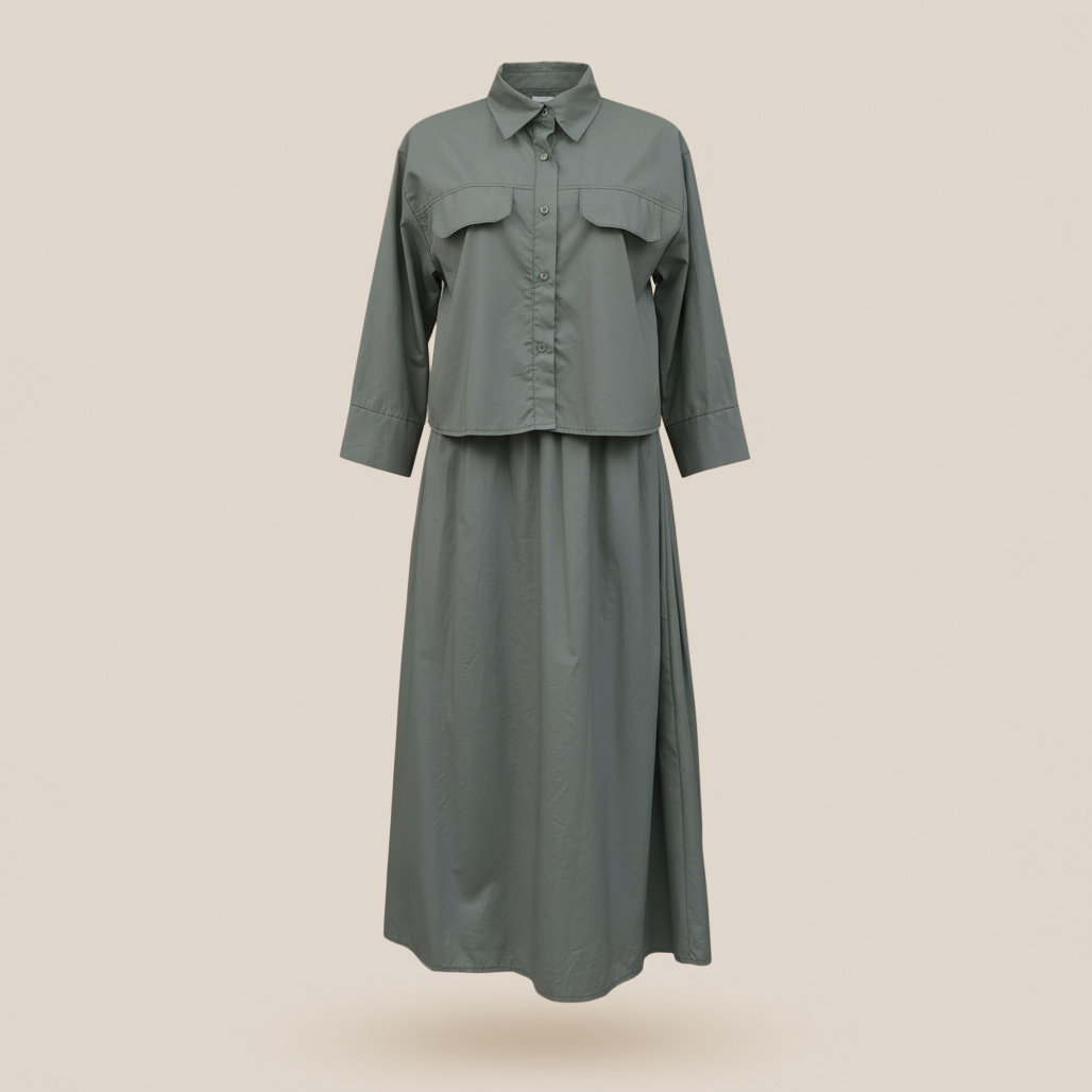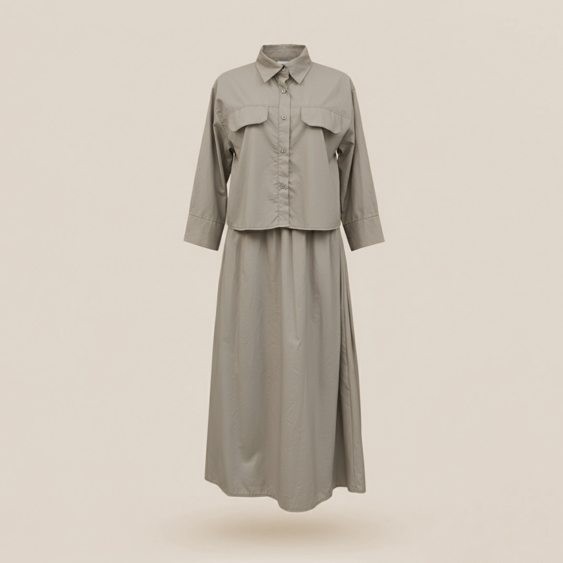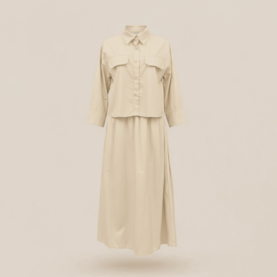 La chemise à manches longues présente une coupe droite légèrement courte, agrémentée de deux poches plaquées sur la poitrine et de boutons ton sur ton pour un rendu soigné. La jupe midi, fluide et légère, repose sur une taille élastique froncée qui s’ajuste en douceur à la morphologie.