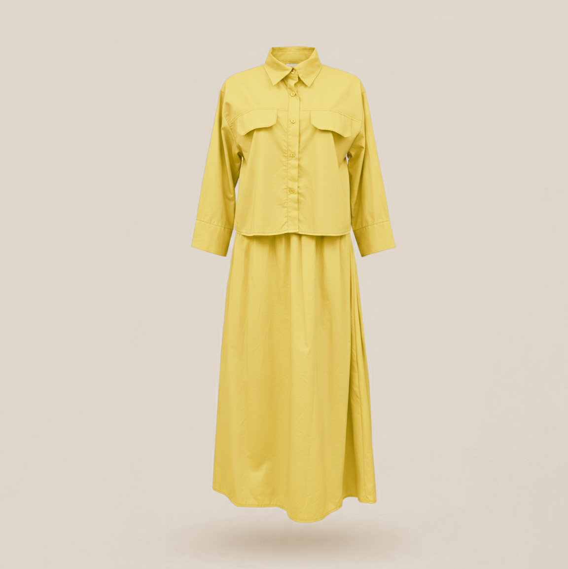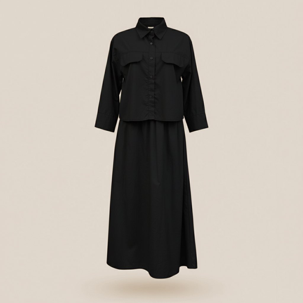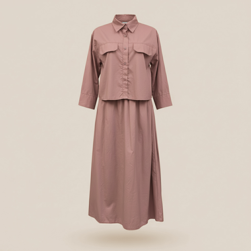 La chemise à manches longues présente une coupe droite légèrement courte, agrémentée de deux poches plaquées sur la poitrine et de boutons ton sur ton pour un rendu soigné. La jupe midi, fluide et légère, repose sur une taille élastique froncée qui s’ajuste en douceur à la morphologie.