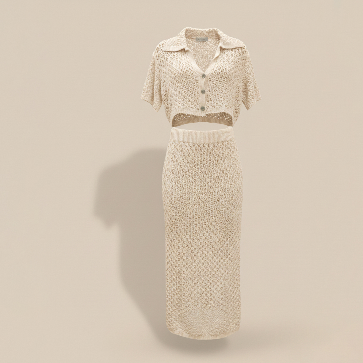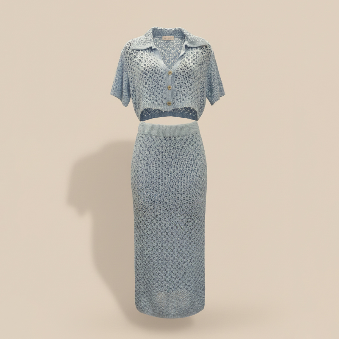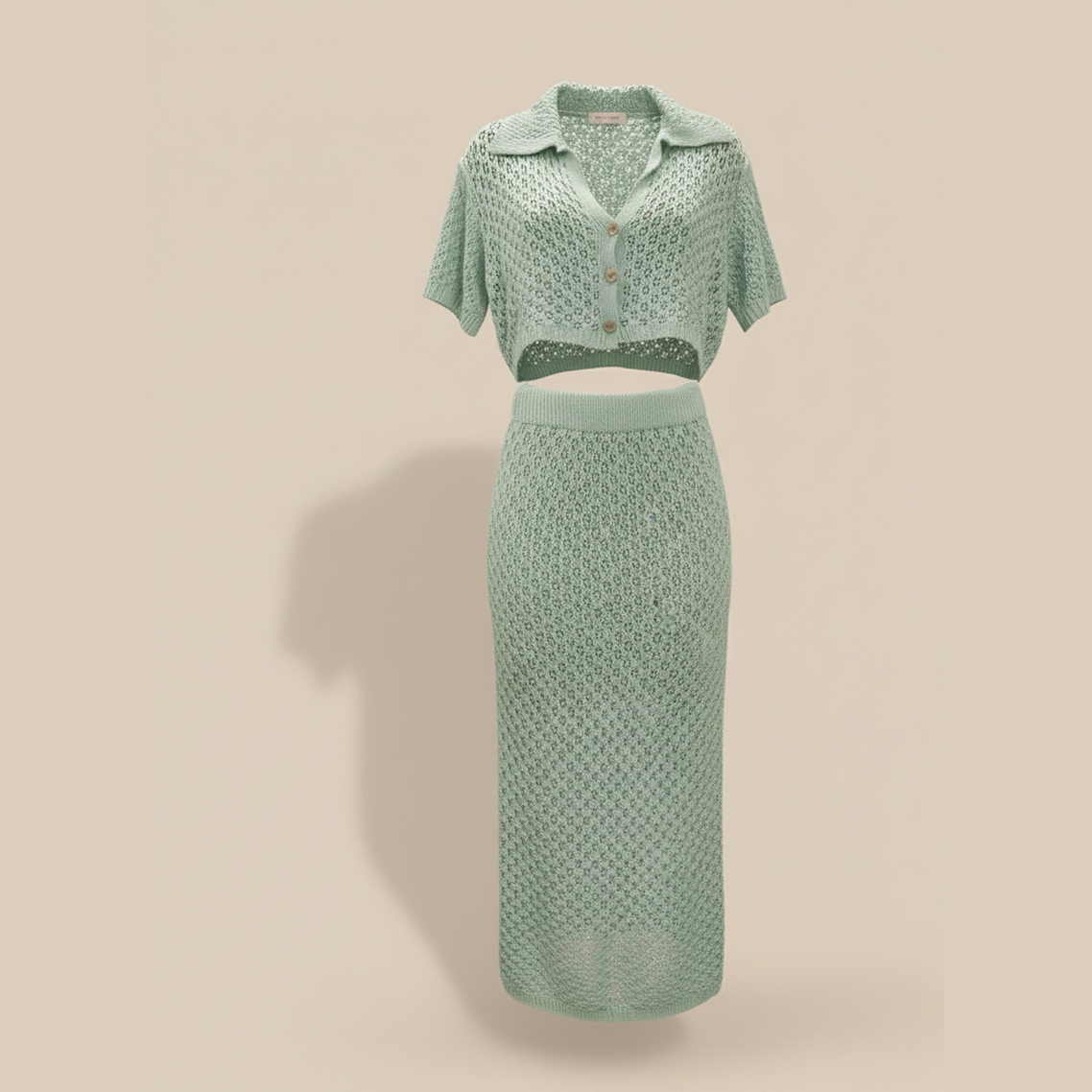 Cet ensemble deux pièces en maille crochet apporte une allure à la fois chic et décontractée.