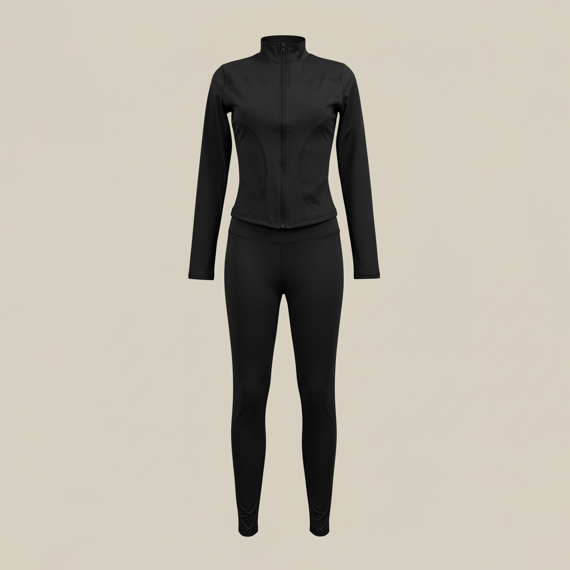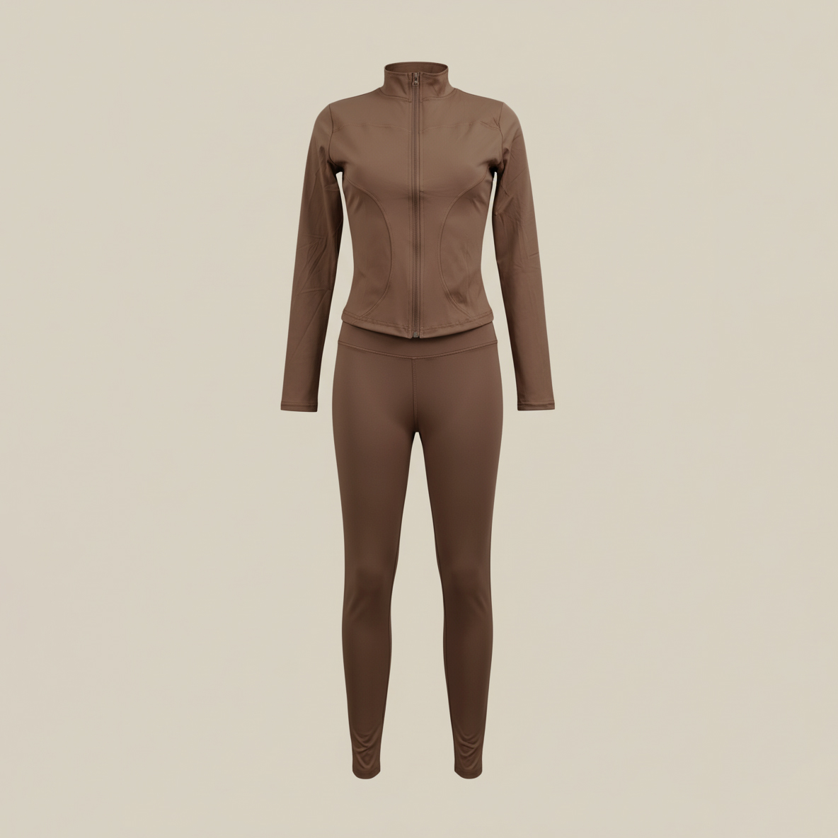 Sa veste cintrée à fermeture éclair épouse la silhouette tout en offrant une grande liberté de mouvement, tandis que le legging assorti assure un maintien parfait et une allure élancée.