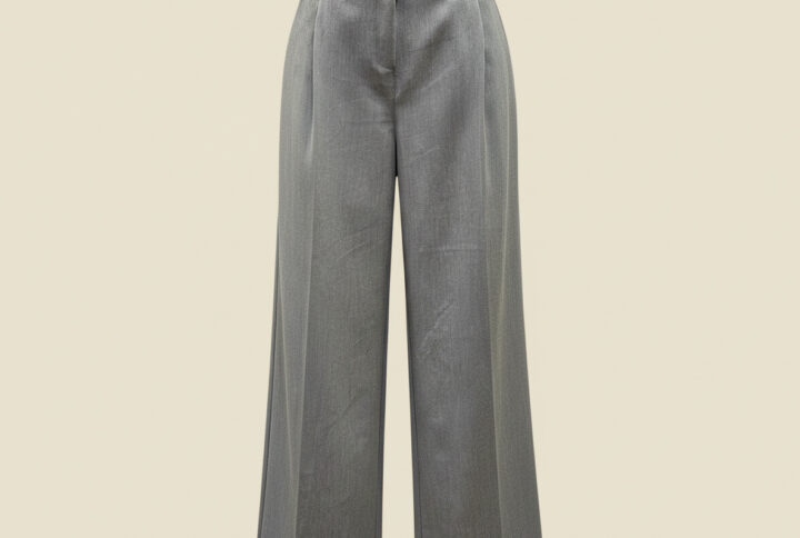 La veste souligne la taille pour un effet structuré, pendant que le pantalon allonge la silhouette grâce à sa coupe fluide en bas.