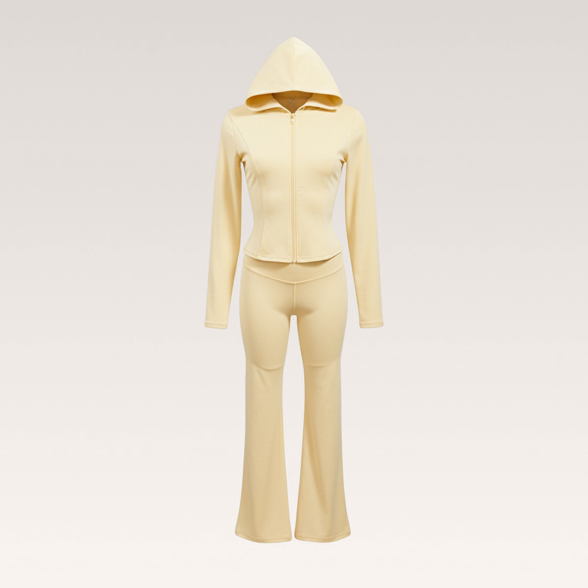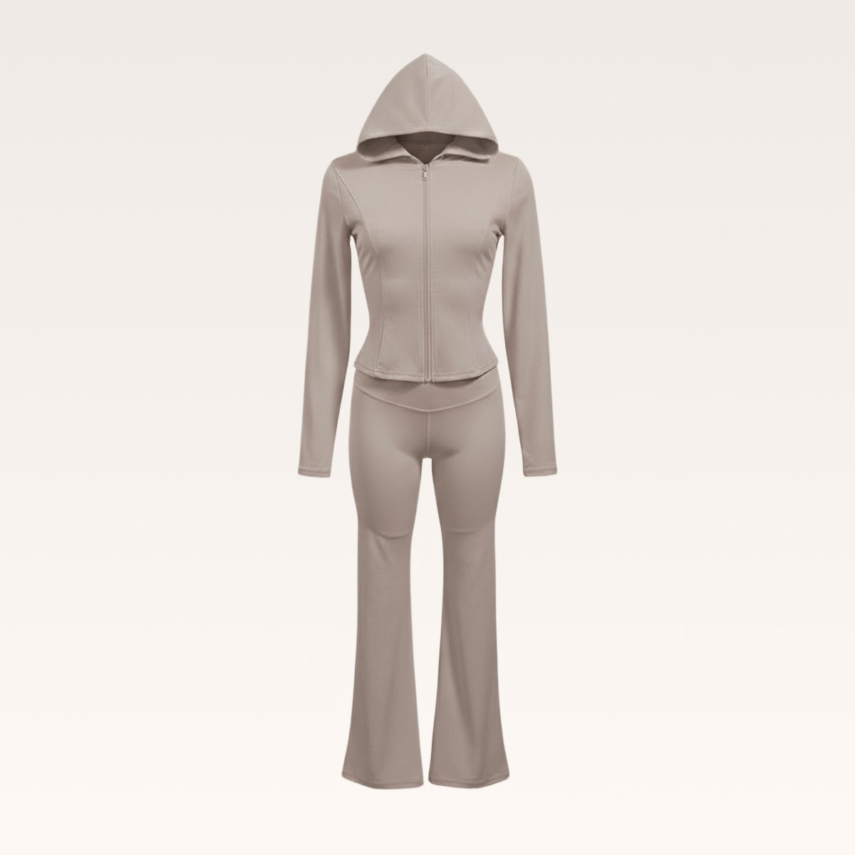 Avec sa veste zippée à capuche et son pantalon coupe évasée, cet ensemble moulant femme épouse les formes tout en offrant une vraie liberté de mouvement. Sa matière stretch assure un confort optimal tout au long de la journée.