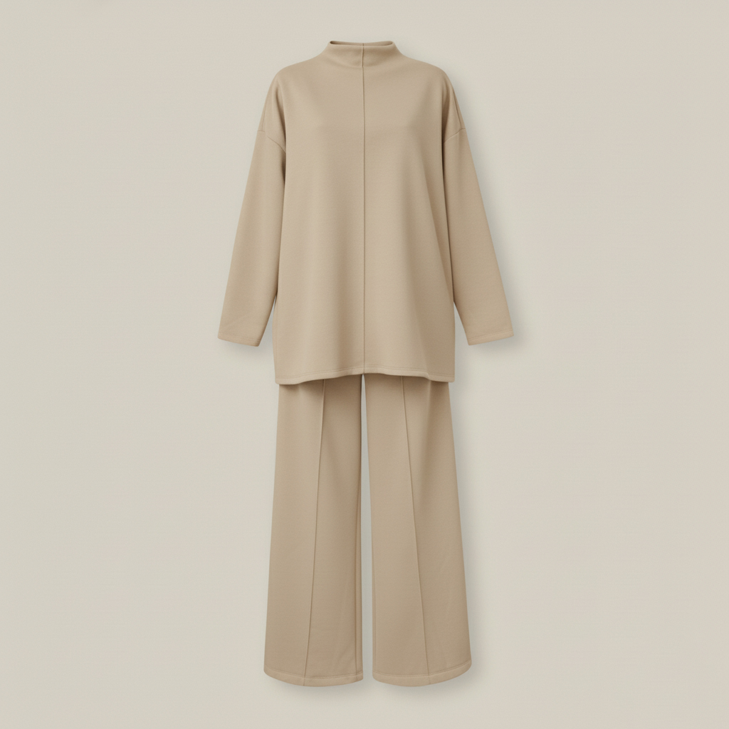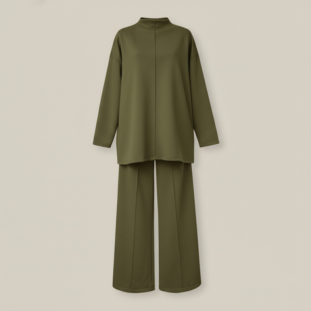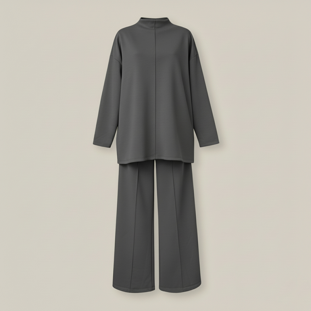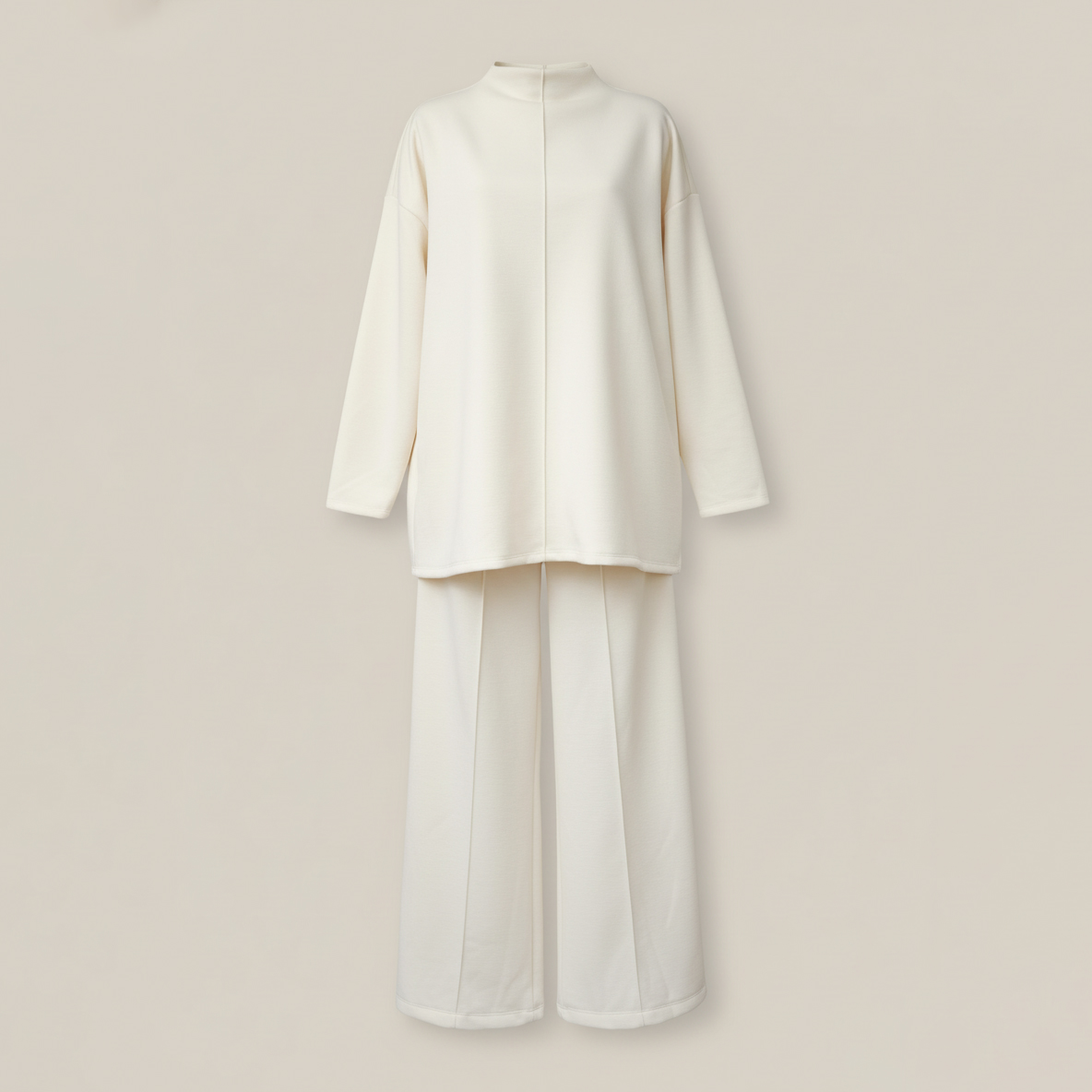 Ensemble fluide composé d’un haut ample à col montant, coupe droite et manches longues au tombé naturel. Le pantalon assorti présente une coupe large et une ligne épurée pour un confort optimal.