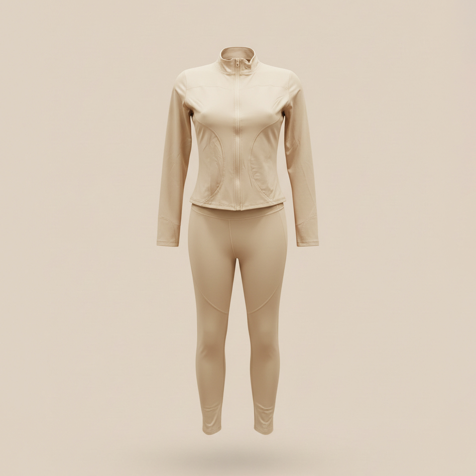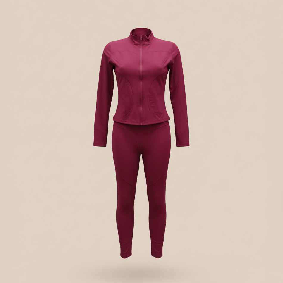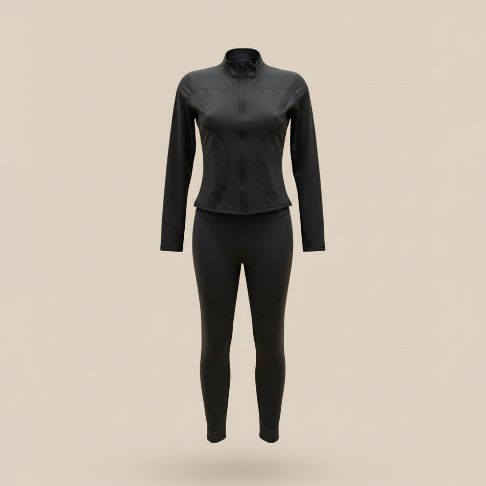 La veste zippée épouse la forme du corps sans comprimer, tandis que le pantalon taille haute assure un excellent maintien.