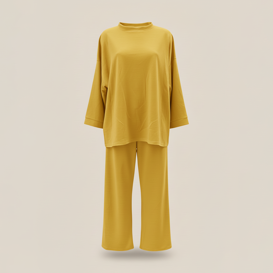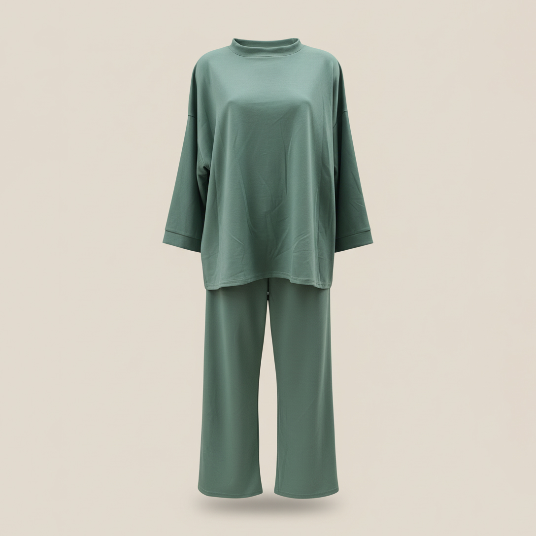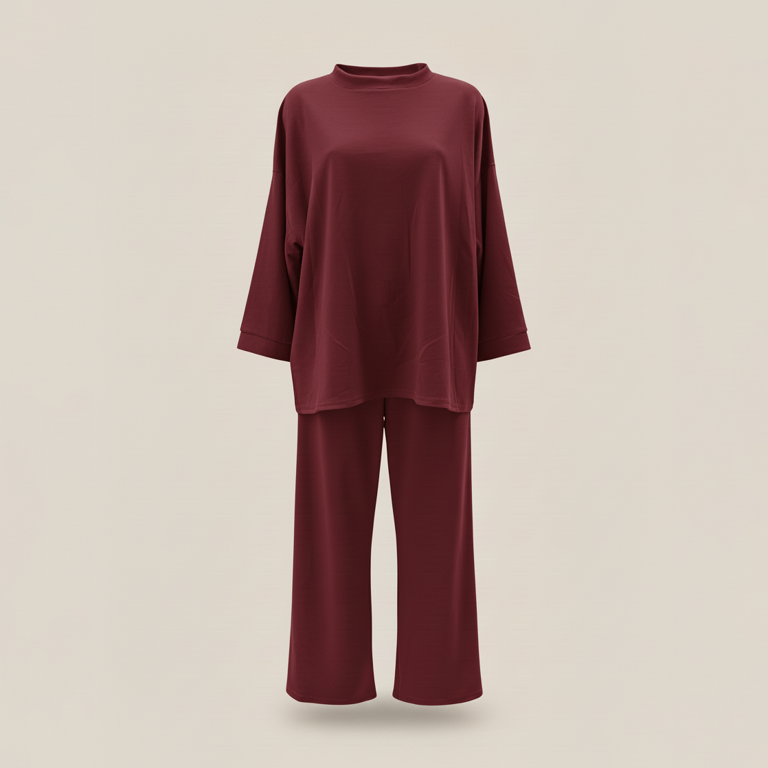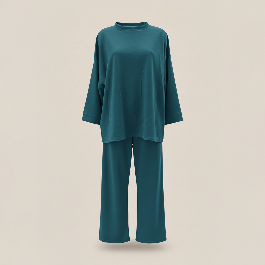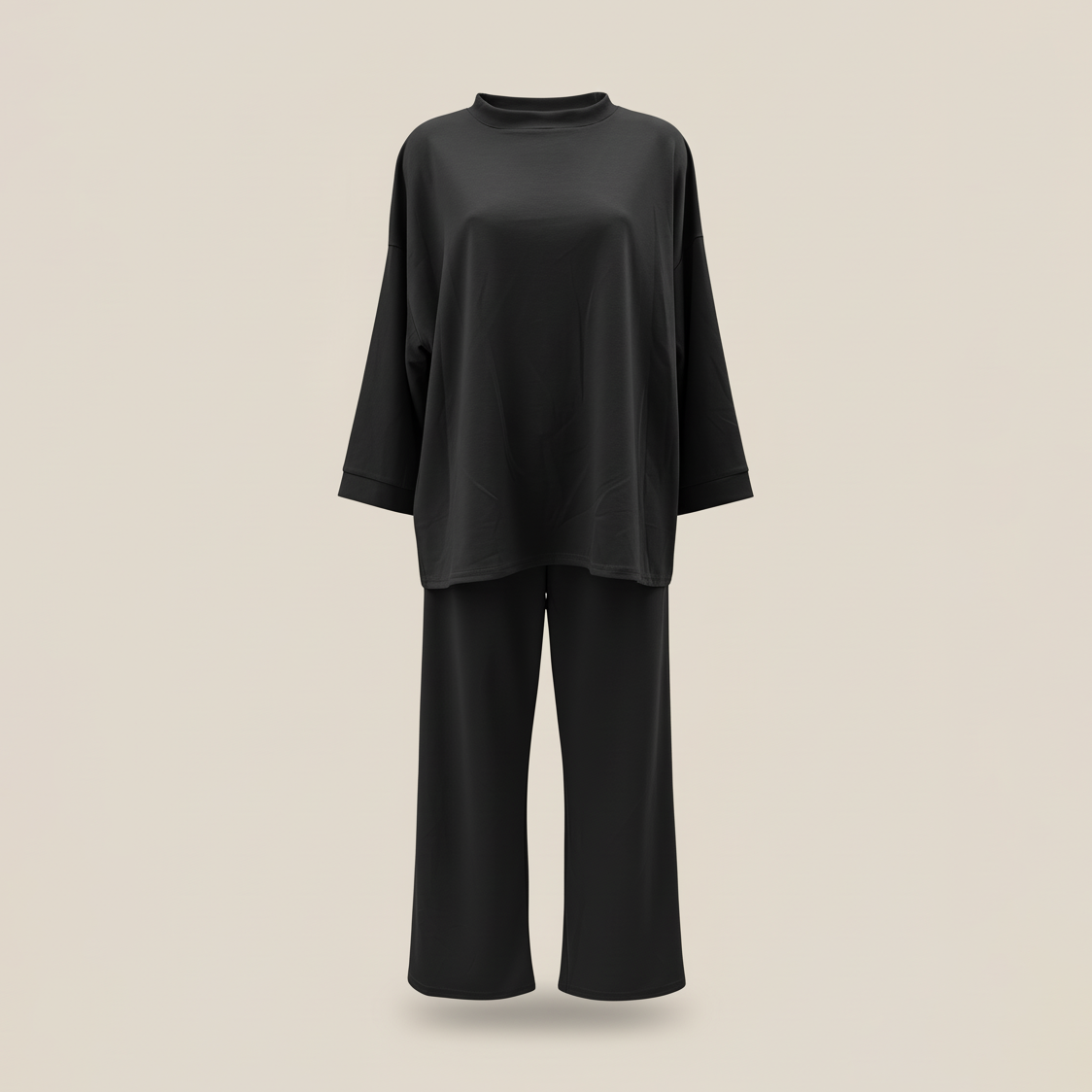 Coupe Longue et Large : Une tunique à manches longues qui couvre les hanches et un pantalon palazzo pour une silhouette fluide et pudique.