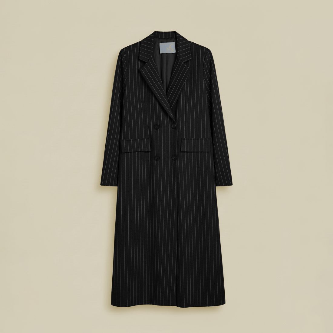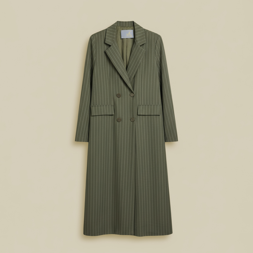Sa coupe droite et élégante est soulignée par des rayures fines verticales qui allongent la silhouette.