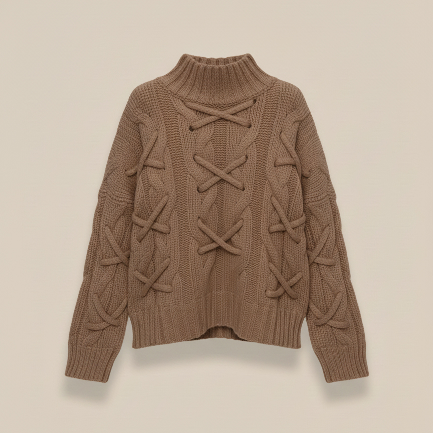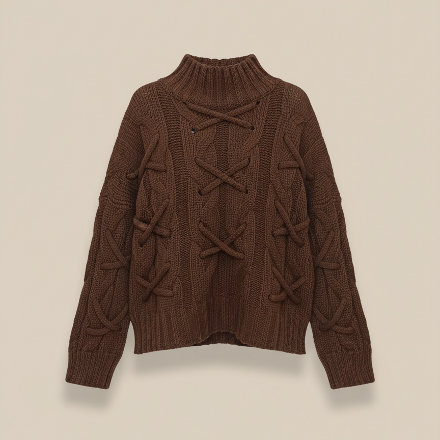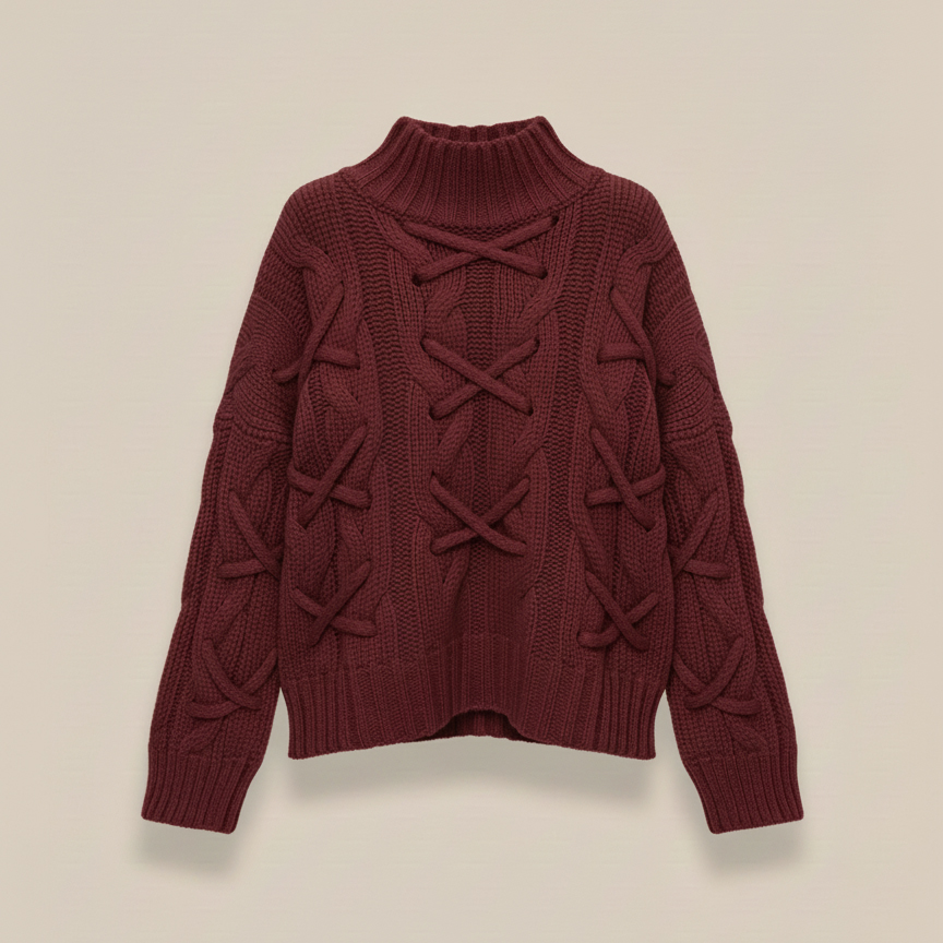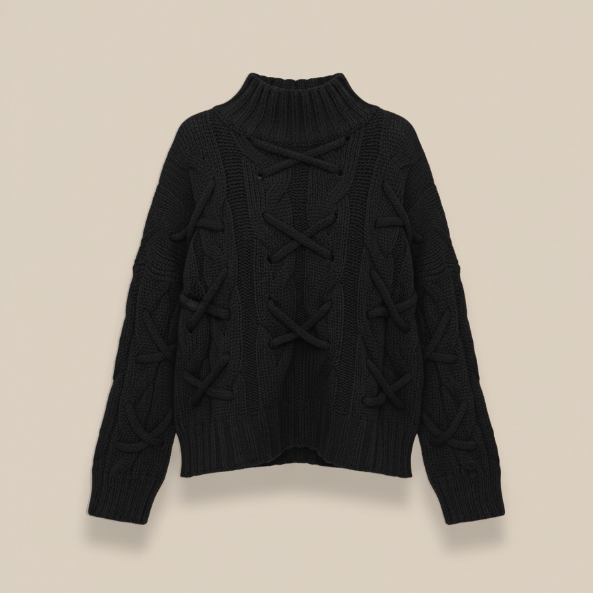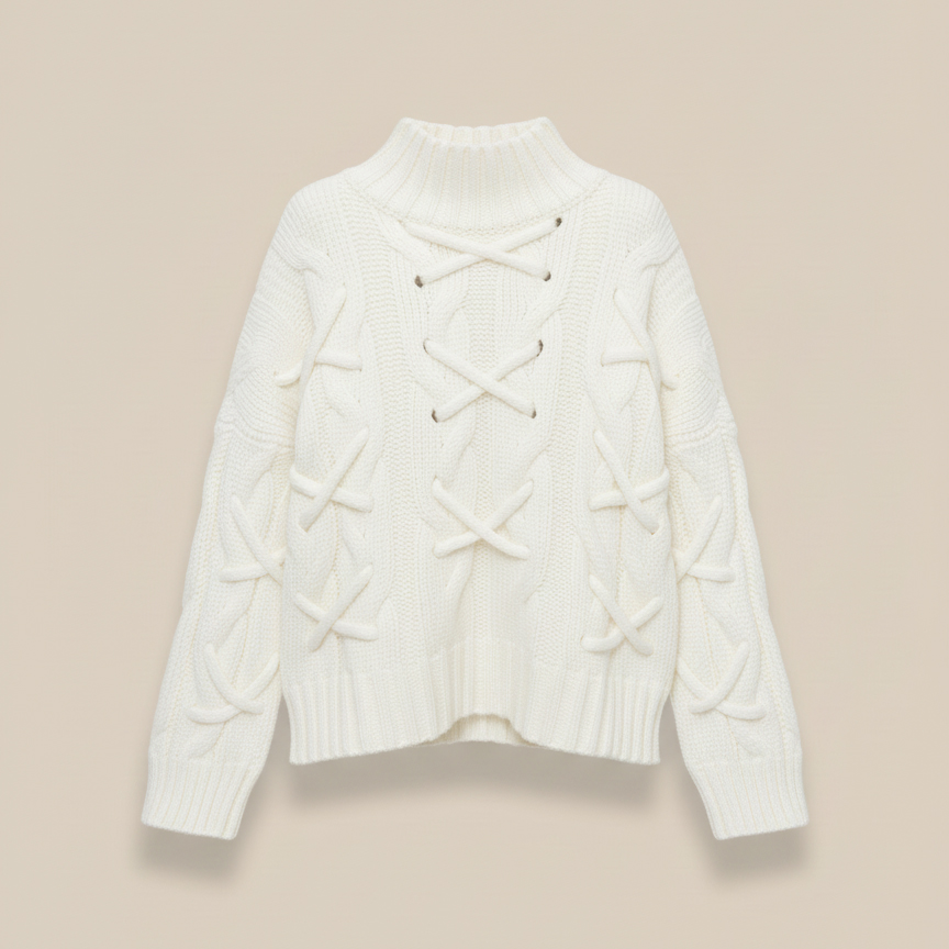 Pull en maille épaisse travaillé avec plusieurs détails noués, créant un effet texturé moderne et original. Modèle à col montant et manches longues, offrant une coupe chaleureuse et structurée.