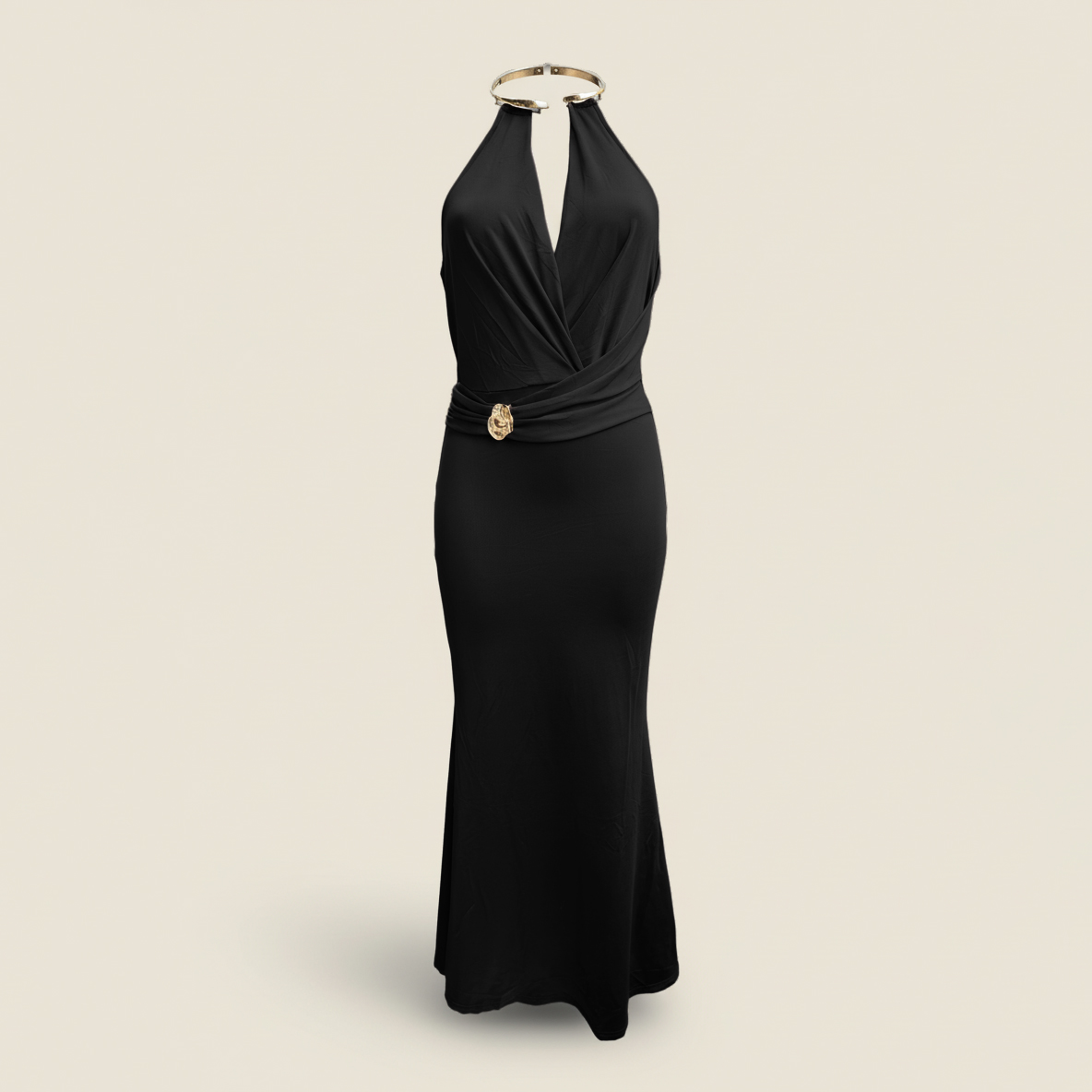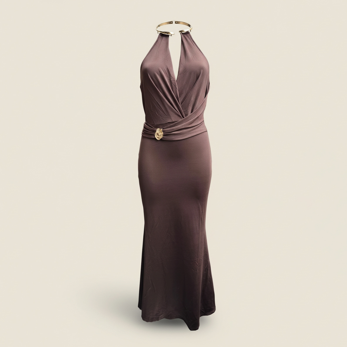Son décolleté drapé met en valeur le buste avec subtilité, tandis que la ceinture ornée d’un bijou doré souligne la taille pour une silhouette gracieuse et élancée.