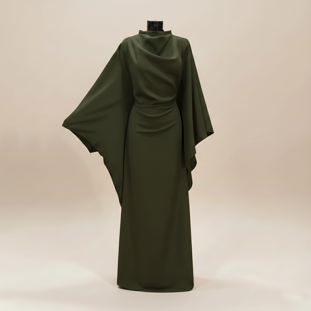 Coupe Majestueuse : Ses manches chauve-souris amples offrent une liberté de mouvement totale et une allure de déesse.