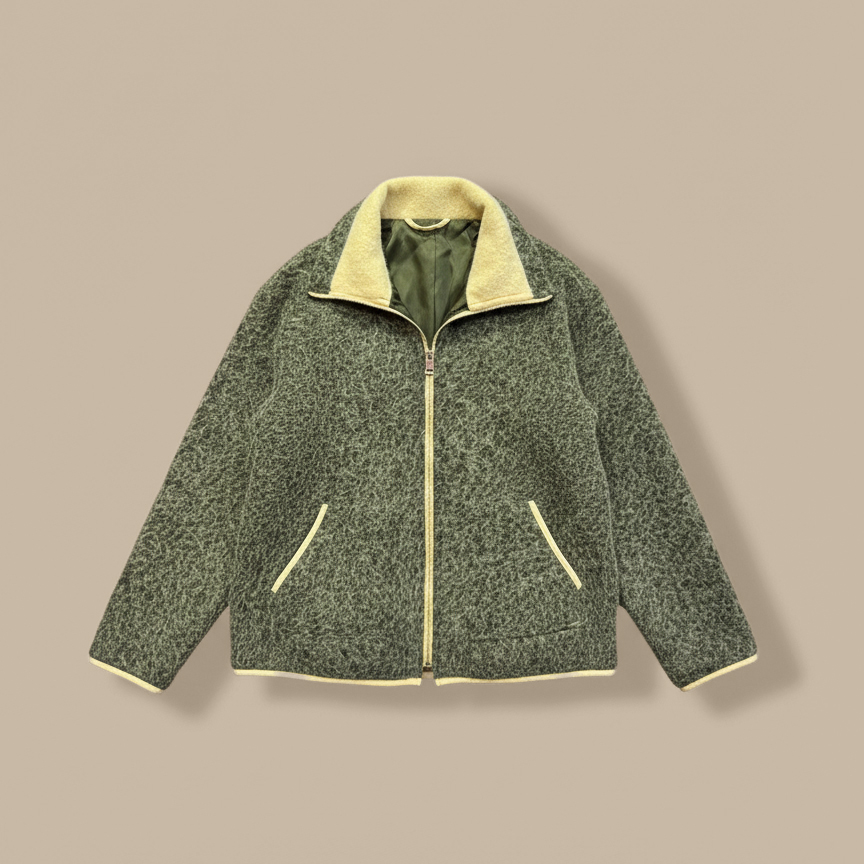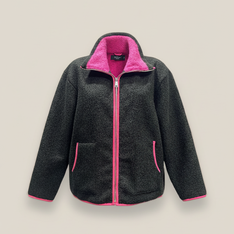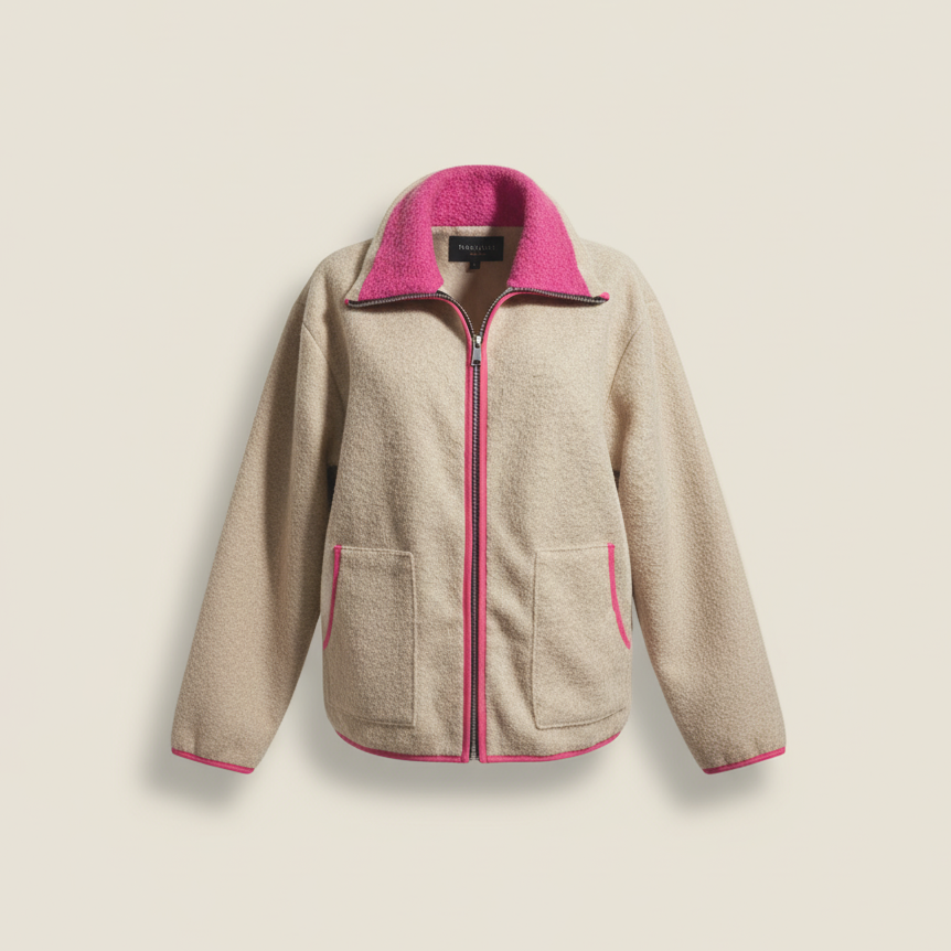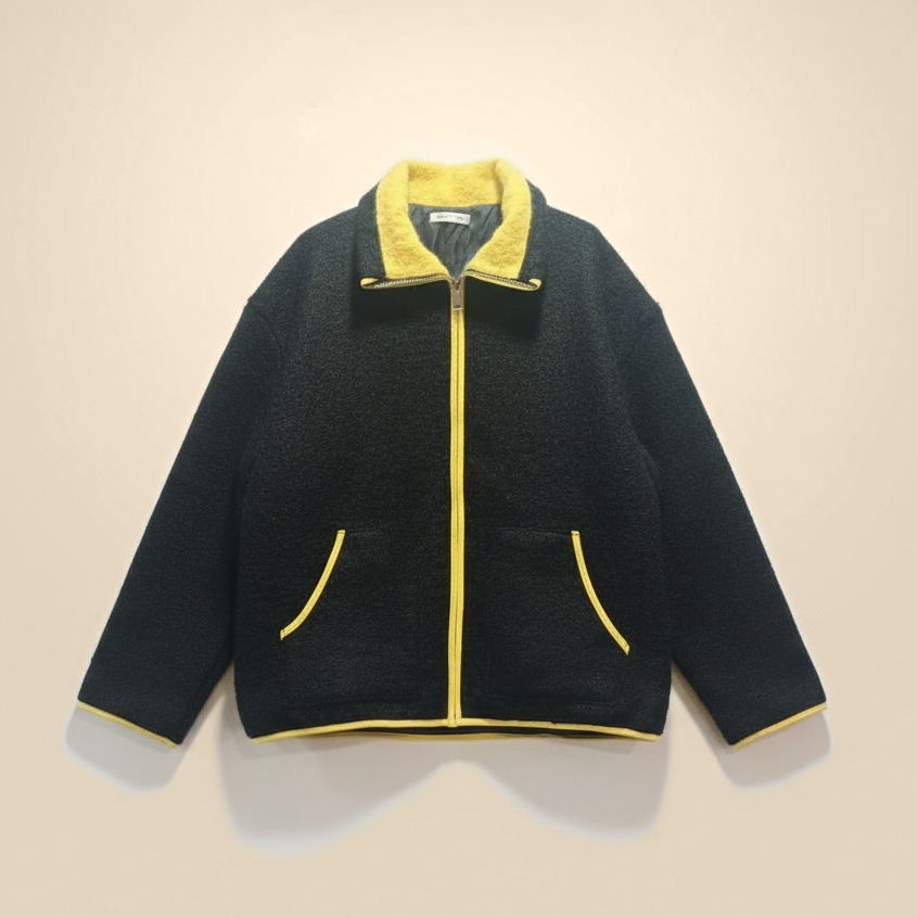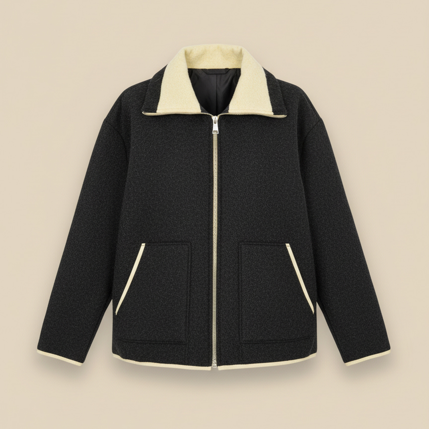 Le design bicolore est l’élément clé, créant un intérêt visuel sans effort. Le col montant clair s’accorde aux finitions des poches, offrant un cadre lumineux à la texture principale.
