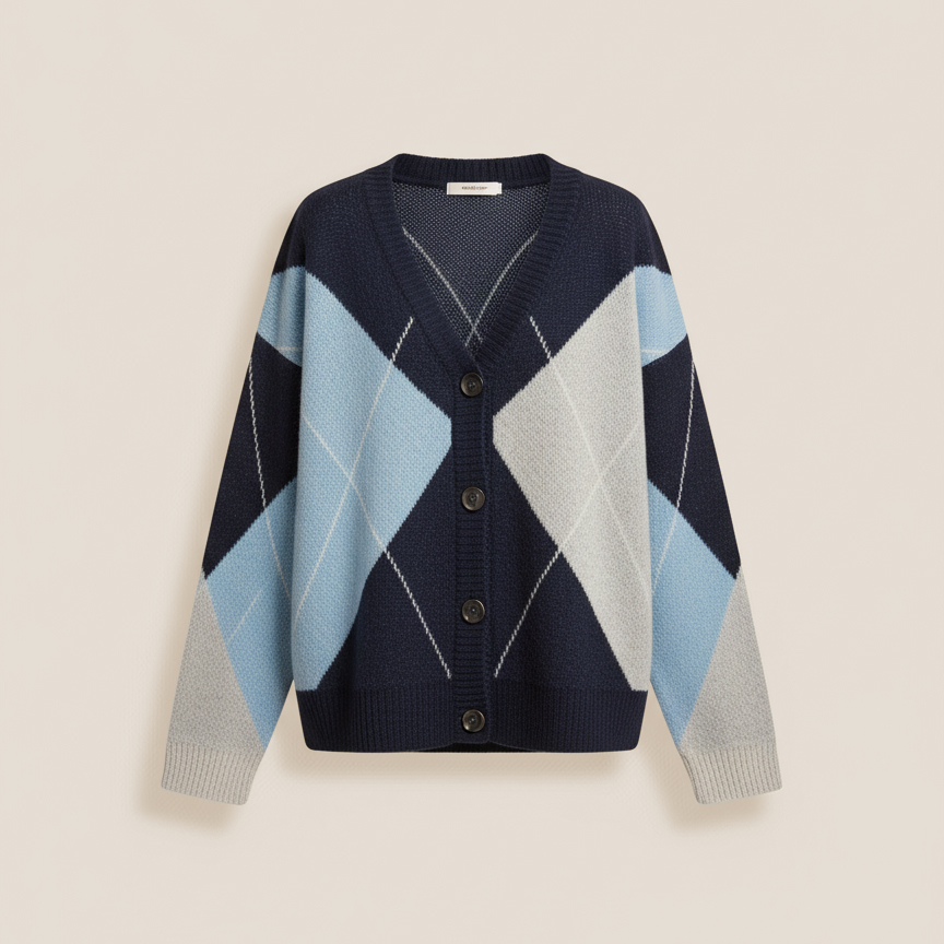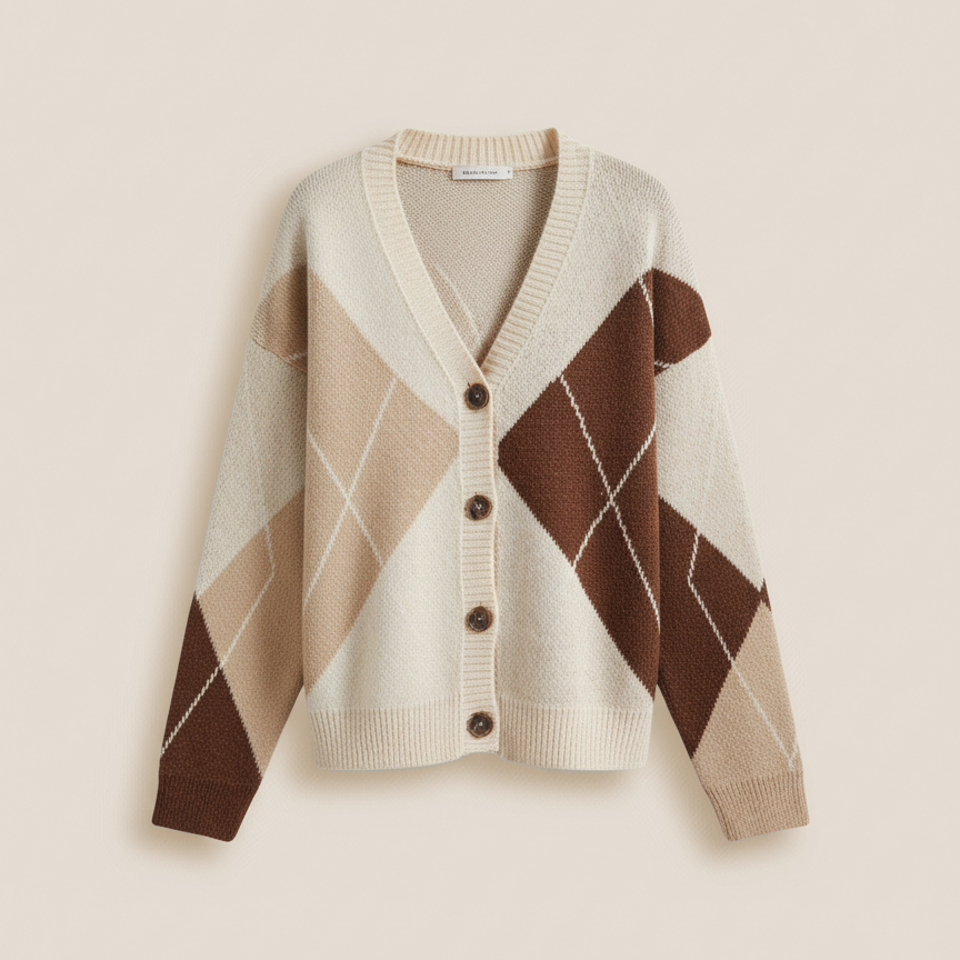 Sa maille douce et épaisse procure une agréable sensation de confort, tandis que son motif à losanges apporte une touche vintage ultra-tendance.